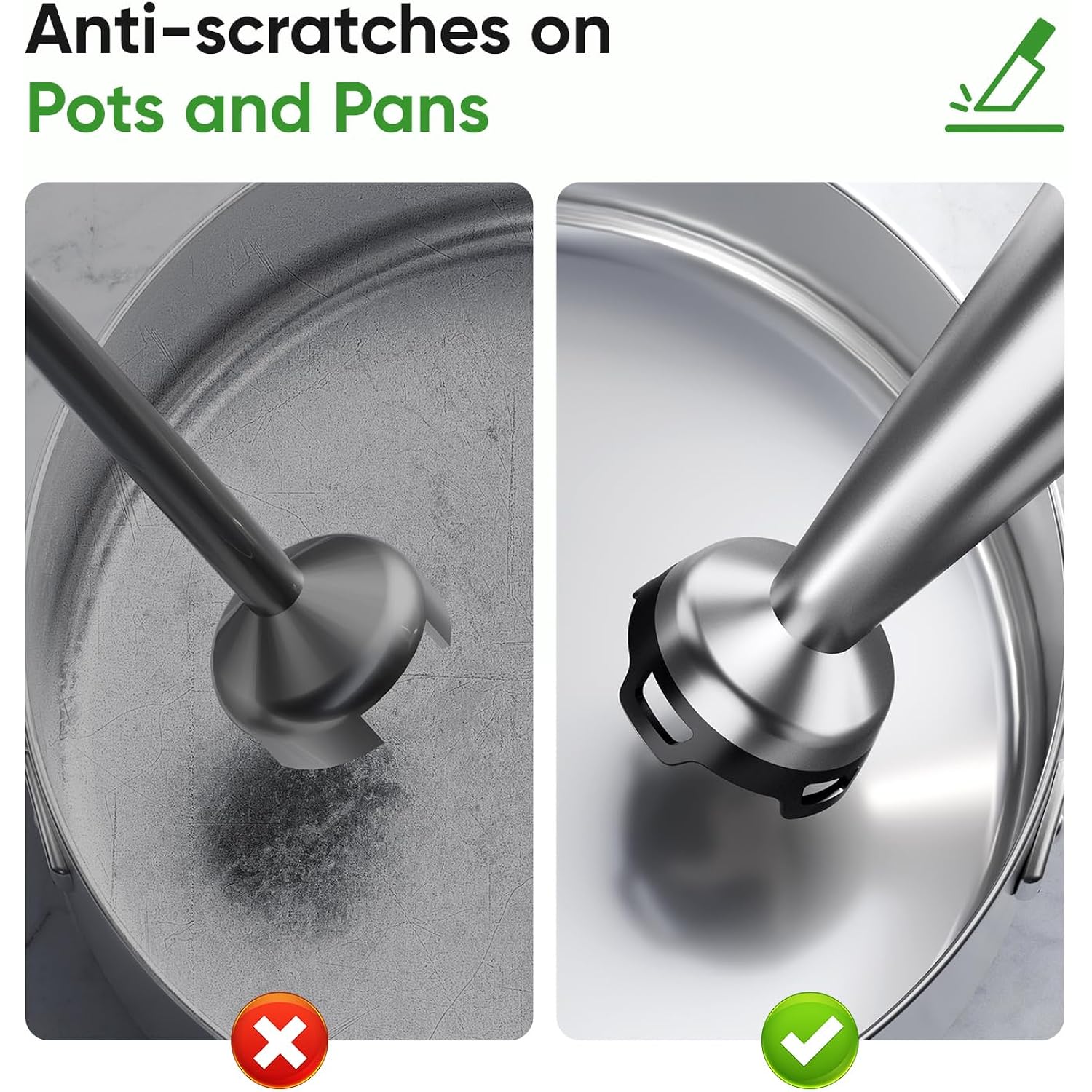 - Protect Your Cookware: This immersion blender handheld has a bell shaped base and food-grade nylon blade guard to protect your pots and pans from scratches and extend the life of kitchen tools. It also can prevents splatter to keep your clothes and kitchen clean