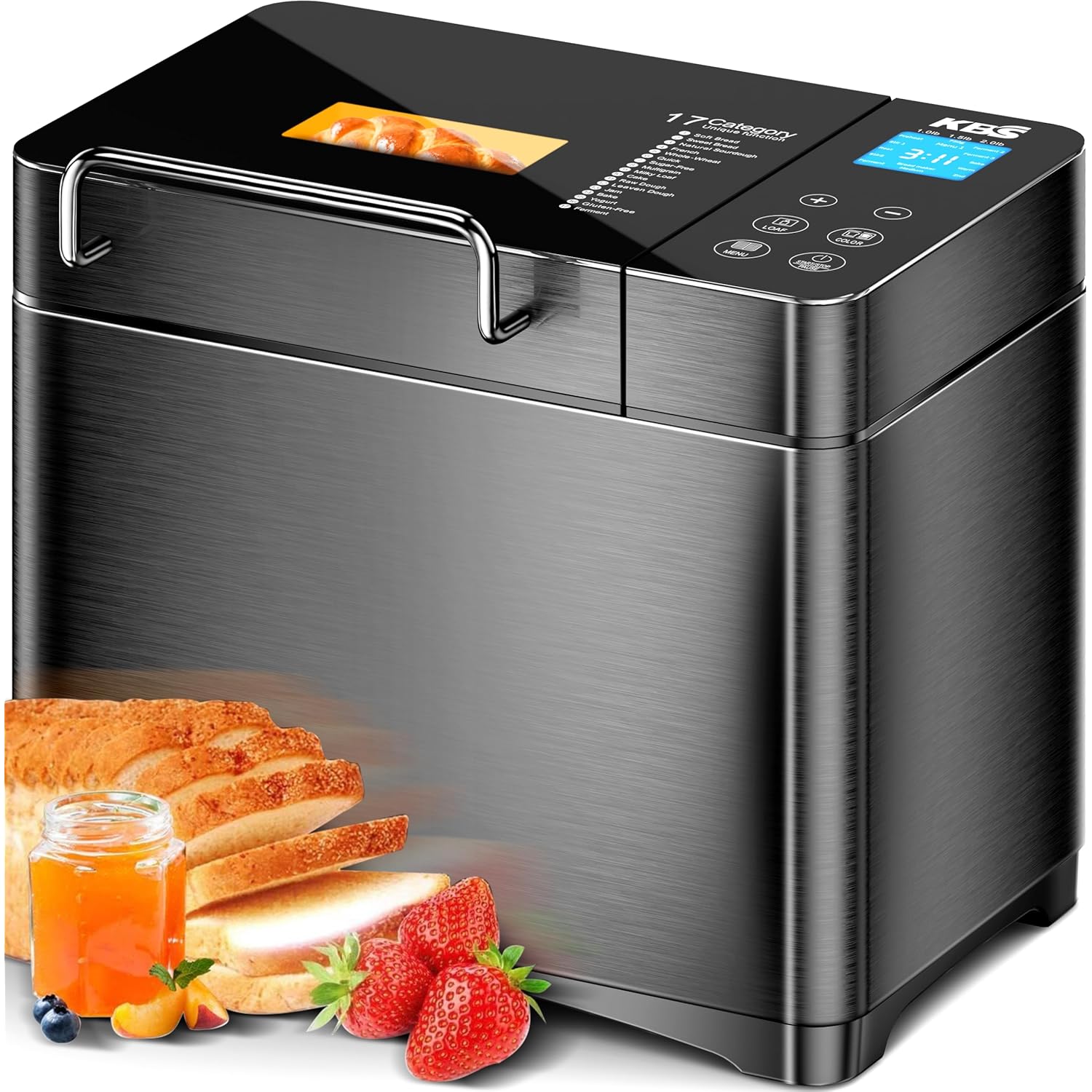 KBS Premium Convection Bread Maker Dual Heater, 17-in-1 Stainless Steel Bread Machine Ceramic Pan, Nut Dispenser,Touch Panel,2lb Loaf 3 Sizes 3 Crust Colors,Gluten-Free,Sourdough,Jam,Yogurt,53 Recipes