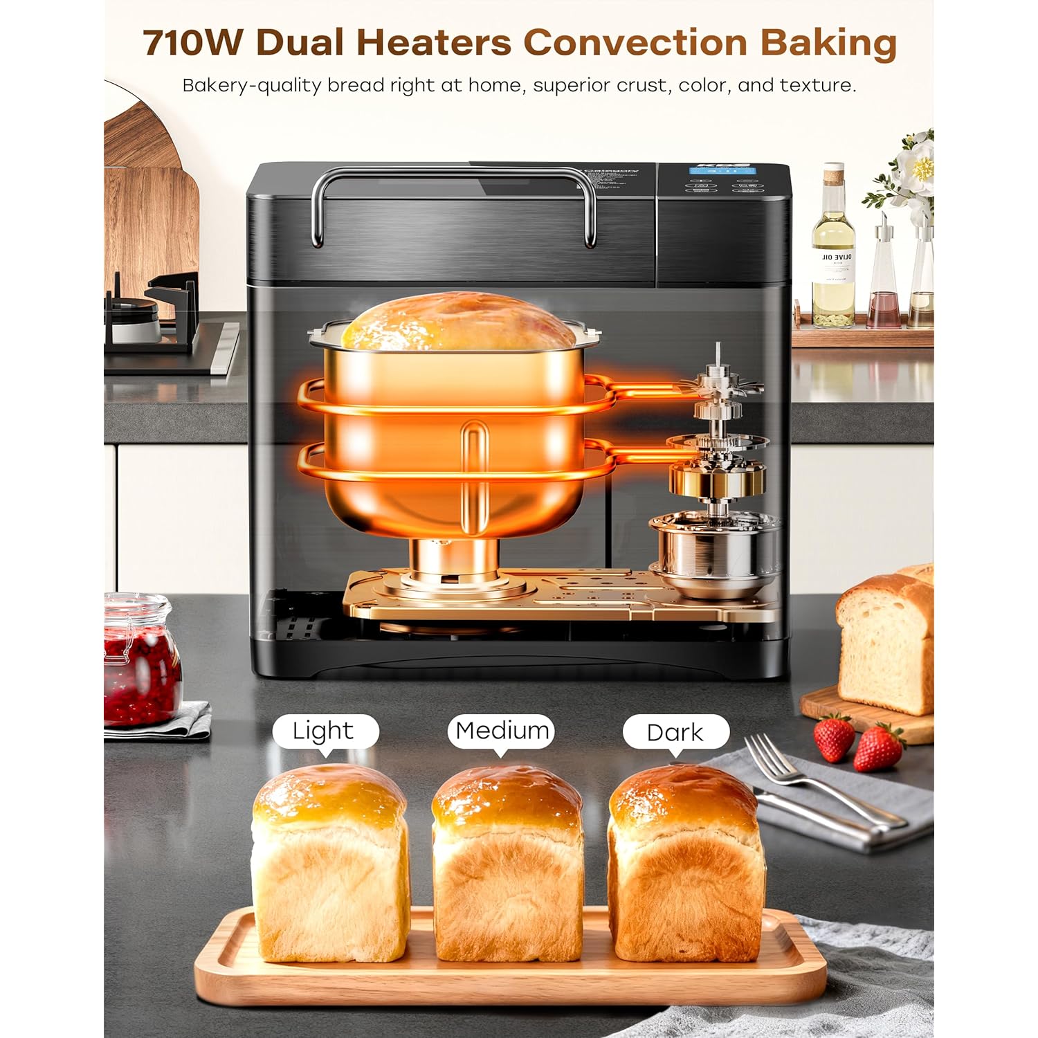 - Dual Heaters Convection ExpressBake & 710W High Power Quiet Kneading: The 710W motor (surpassing the 600W standard) and specially placed ribs to replicate artisan kneading for ideal texture. Advanced dual NTC & PID temperature control ensures consistent warmth and perfect 100℉ rising. The KBS bread machine uses 360° true convection to ensure even and fast baking, crispier crust and fluffy interior—even for novices. Experience bakery-quality bread in under 90 minutes.